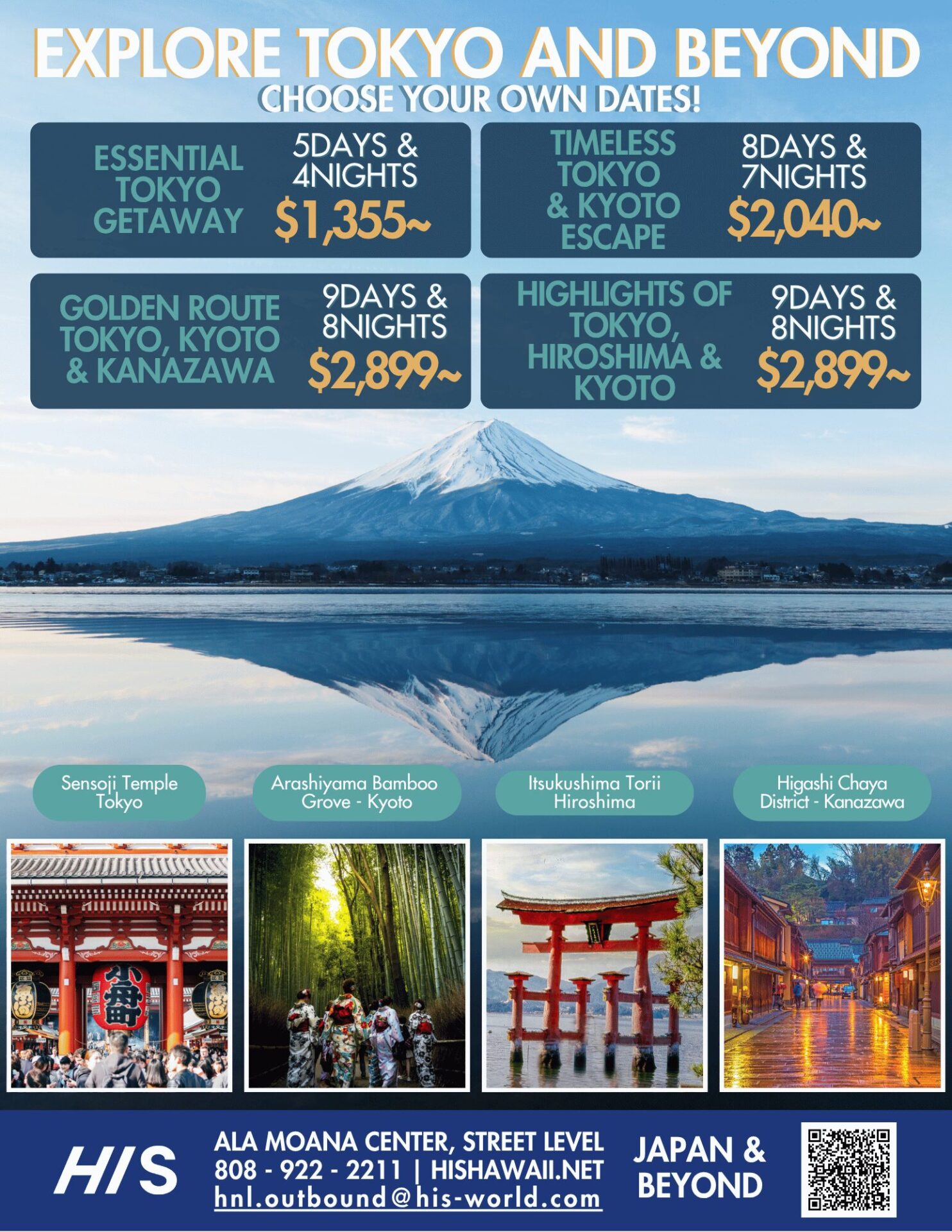 All of our group tours are custom-designed and only offered through HIS. Fully escorted from Honolulu by our local staff members! Focusing on quality over quantity, we strive to provide the most responsive, accommodating, friendly customer service, and always incorporate unique activities that let you interact with residents of Japan in fun and memorable ways. We also strongly emphasize regional, seasonal cuisine, utilizing knowledge gained from our local offices and in-country experts to bring you to phenomenal restaurants that are sure to satisfy.