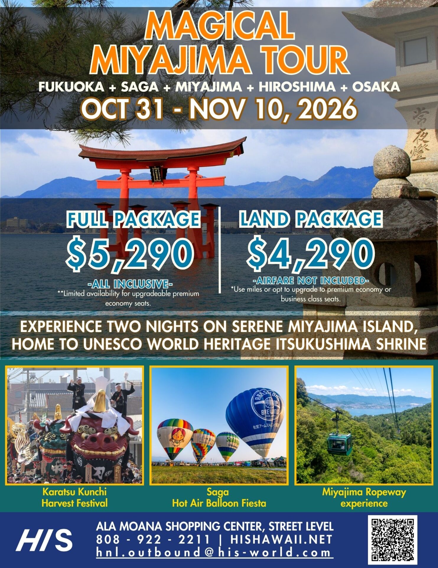 Our brand-new tour, Magical Miyajima, is here to transport you to a world far away from ordinary. Spend two nights on UNESCO World Heritage site Miyajima “Shrine Island”, stand beneath giant hot air balloons soaring the skies at the Saga International Balloon Festival, and much more! Check out the details here: Magical Miyajima Tour 2026
