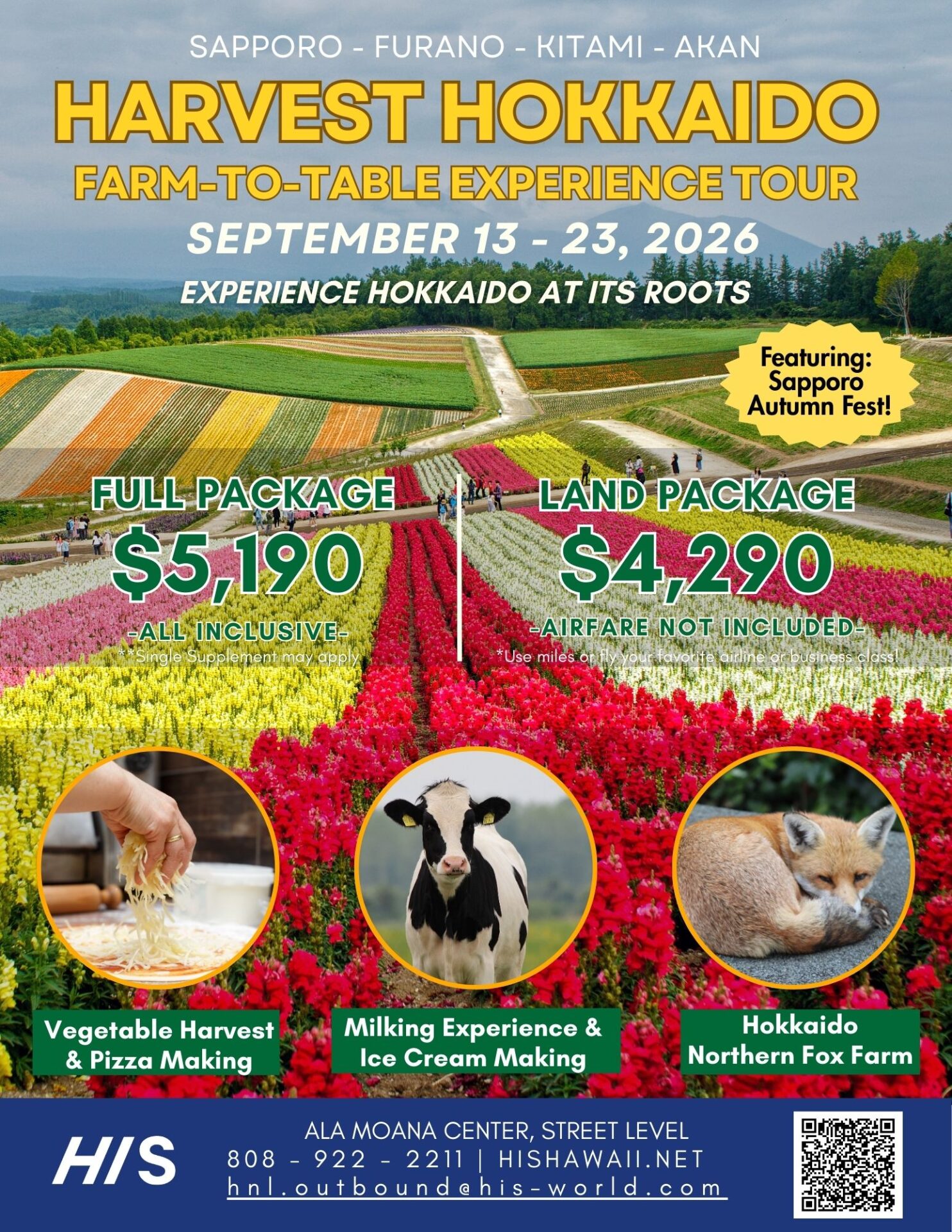 Escape to Hokkaido during the refreshing early-autumn season and discover the roots of this region’s superb cuisine! Multiple unique farm experiences and the Sapporo Autumn Festival await you this September–get all the details here: Harvest Hokkaido Tour 2026